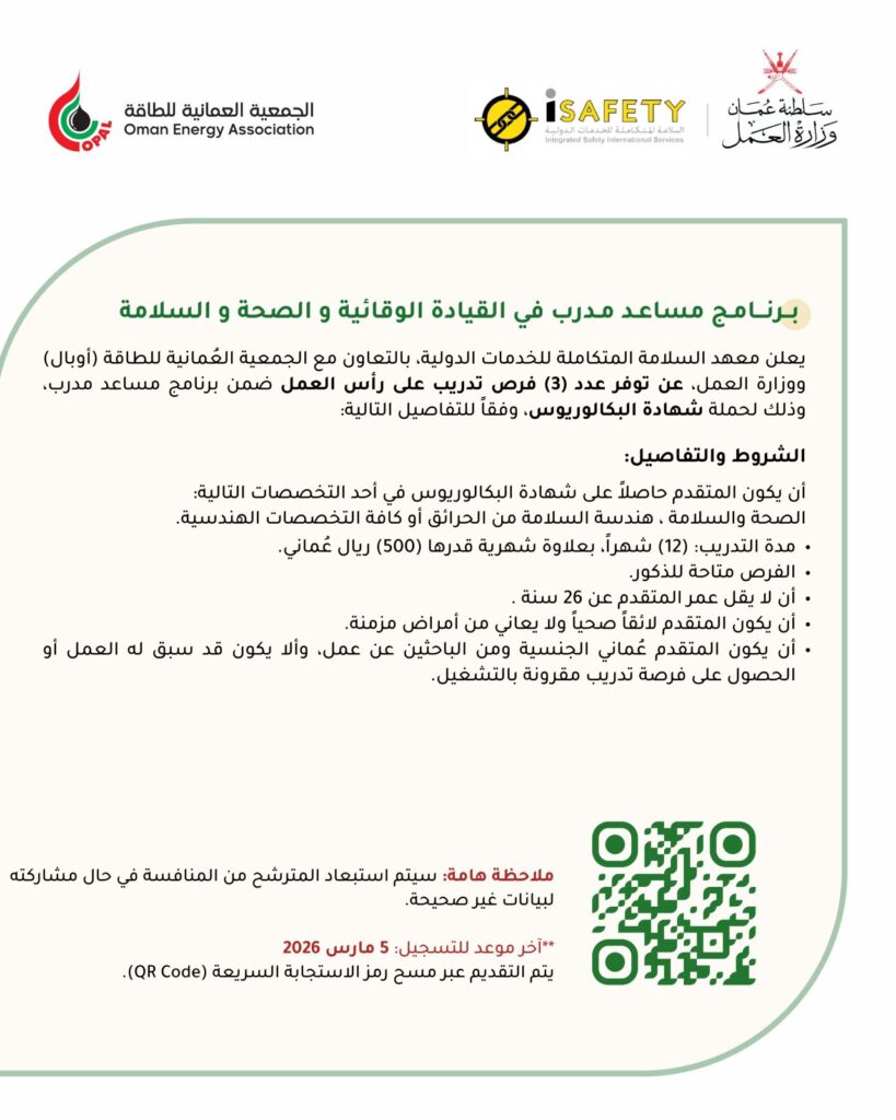أعلن معهد السلامة المتكاملة للخدمات الدولية، بالتعاون مع الجمعية العمانية للطاقة (أوبال) و وزارة العمل، عن توفر (3) فرص تدريبية على رأس العمل ضمن برنامج “مساعد مدرب في القيادة الوقائية والصحة والسلامة”.