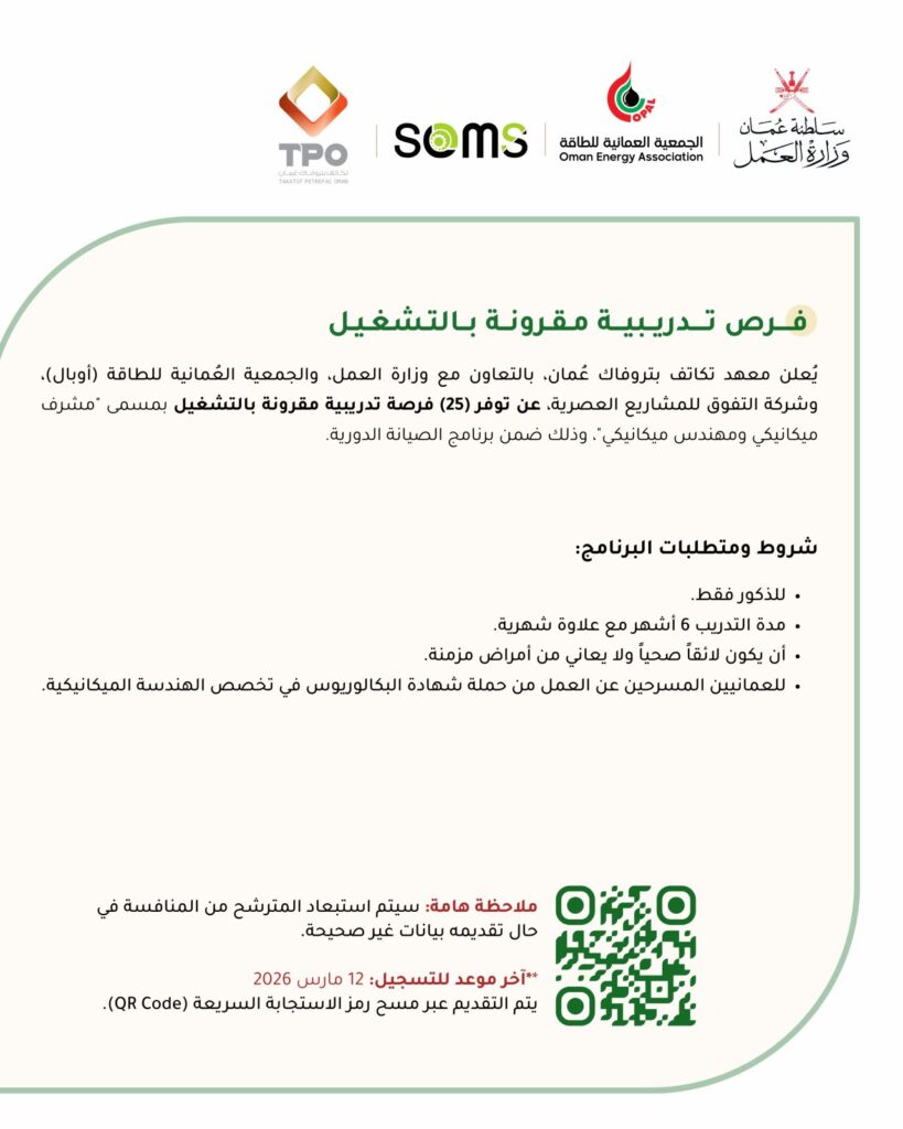 أعلن يعلن معهد تكاتف بتروفاك عُمان، بالتعاون مع وزارة العمل والجمعية العُمانية للطاقة (أوبال) وشركة التفوق للمشاريع العصرية، عن فتح باب التسجيل لـ (25) فرصة تدريبية مقرونة بالتشغيل بمسمى “مشرف ميكانيكي ومهندس ميكانيكي”.